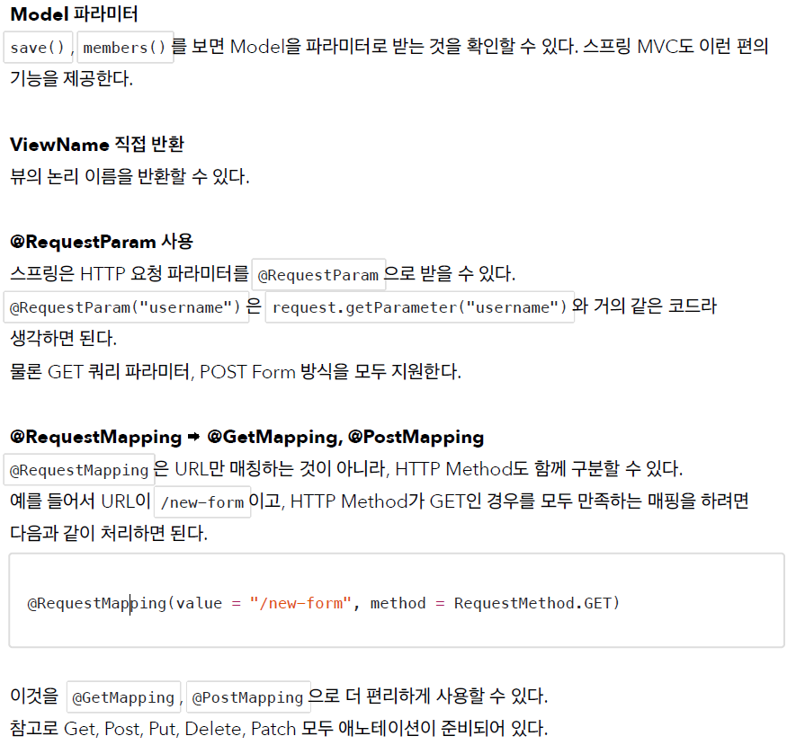 - @PostMapping("/save") 어노테이션은 save 메서드를 HTTP POST 요청에 대한 "/springmvc/v3/members/save" 경로와
