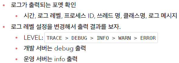 - 로그 레벨에 따라 개발 서버에서는 모든 로그를 출력하고, 운영서버에서는 출력하지 않는 등 로그를 상황에
