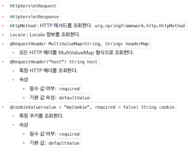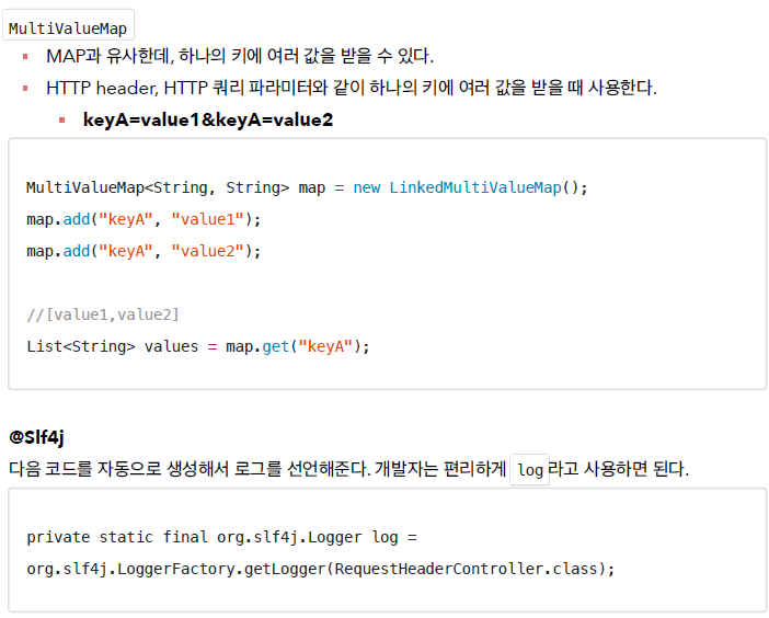- @RequestHeader MultiValueMap<string, string> headerMap</string, string> : HTTP 요청의 헤더 정보를 MultiValueMap 형식으로 가져옴.