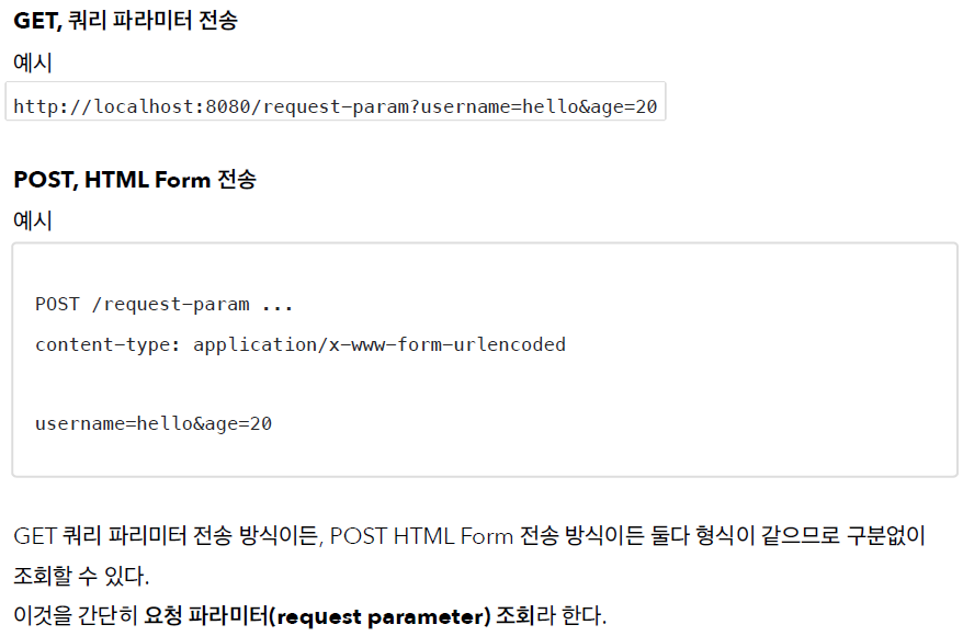 HttpServletRequest 의 request.getParameter() 를 사용하면 다음 두가지 요청 파라미터를 조회할 수 있다.
