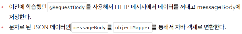 - HTTP 메시지 컨버터는 문자 뿐만 아니라 JSON도 객체로 변환해주는데,