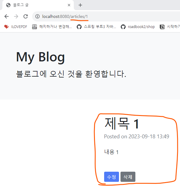 - 즉, 쿼리 파라미터가 있는 경우 컨트롤러 메서드는 수정을 해야 하므로 엔티티를 조회하여 기존 글 데이터를 모델에 넣어 화면에 보여줘야 한다.