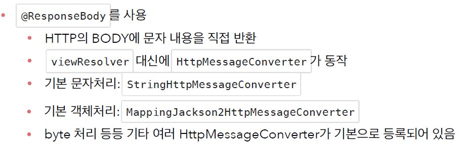 HTTP API처럼 JSON 데이터를 HTTP 메시지 바디에서 직접 읽거나 쓰는 경우 HTTP 메시지 컨버터를 사용하면 편리하다.