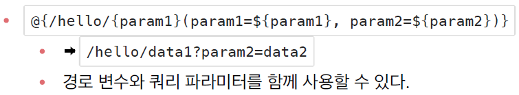 - "path variable + query parameter" 텍스트로 표시되는 하이퍼링크를 생성하며, 경로 변수 param1과 쿼리 매개변수 param2를 포함한 "/hello/{param1}" URL을 생성한다.