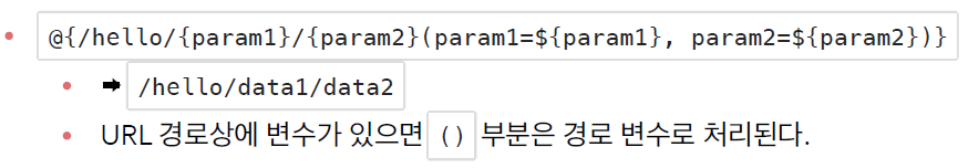 - "path variable" 텍스트로 표시되는 하이퍼링크를 생성하며, 경로 변수 param1과 param2를 포함한 "/hello/{param1}/{param2}" URL을 생성한다.