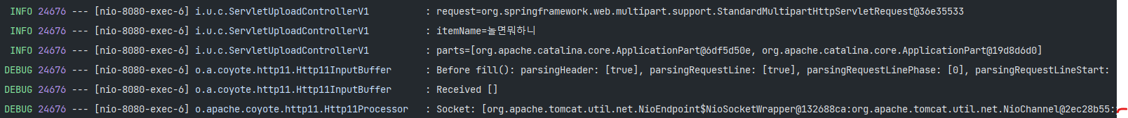 2023-09-25 14:13:20.435 DEBUG 24676 --- [nio-8080-exec-6] o.a.coyote.http11.Http11InputBuffer      : Received [POST /servlet/v1/upload HTTP/1.1 ~~~ 이렇게 쭉 나온다.
