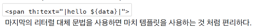 <li>리터럴 대체 |hello ${data}| = <span th:text="|hello ${data}|"></span></li>