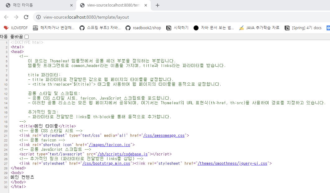 이 부분은 template/layout/base 템플릿에서 common_header 템플릿 프래그먼트를 현재 페이지의 <head>로 대체한다. - ~{::title}은 현재 페이지의 타이틀을 의미하며, "메인 타이틀"로 설정된다.