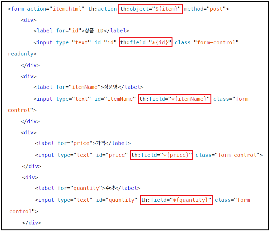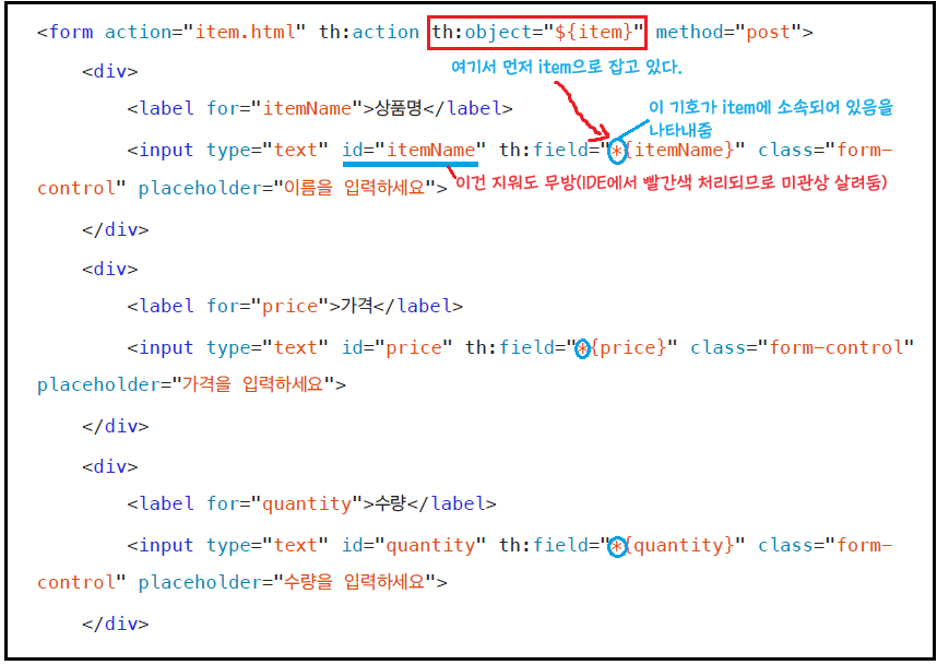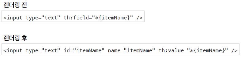 <input type="text" id="itemName" name="itemName" th:field="*{itemName}" class="form-control" placeholder="이름을 입력하세요">
