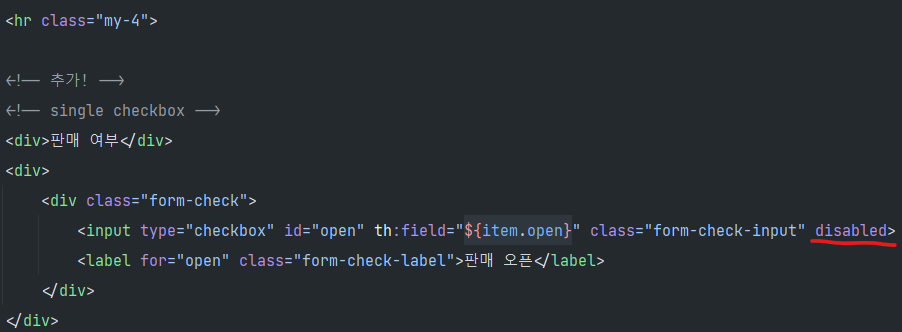 : item.html 에는 th:object 를 사용하지 않았기 때문에 th:field 부분에 ${item.open} 으로 적어주어야 한다.