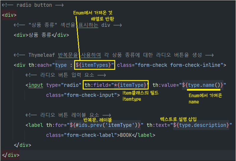 <!-- Thymeleaf 반복문을 사용하여 각 상품 종류에 대한 라디오 버튼을 생성 -->