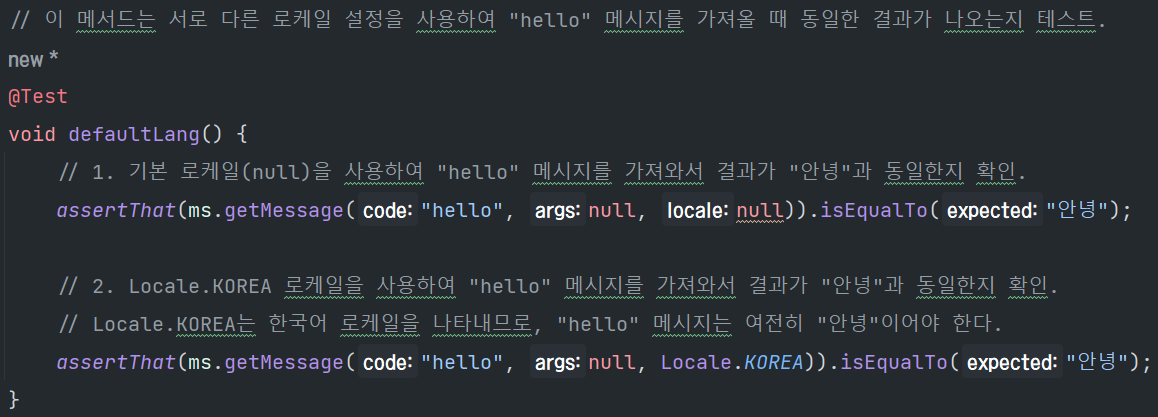 assertThat(ms.getMessage("hello", null, Locale.KOREA)).isEqualTo("안녕");
