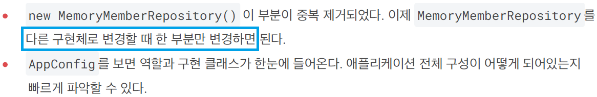 // 애플리케이션의 전체 동작 방식을 구성(config)하기 위해, 구현 객체를 생성하고, 연결하는 책임을 가지는 별도의 설정 클래스