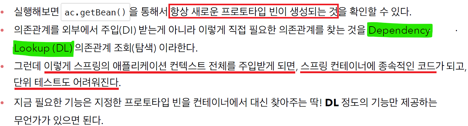 > 참고: 스프링이 제공하는 메서드에 @Lookup 애노테이션을 사용하는 방법도 있지만, 이전 방법들로 충분하고,