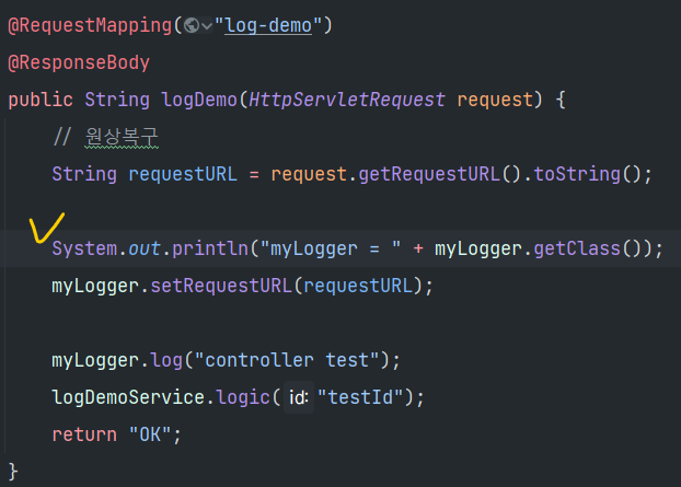 myLogger.log("service id = " + id); // 여기