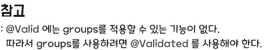 - 이런 문제를 해결하기 위해 Bean Validation은 groups라는 기능을 제공한다.