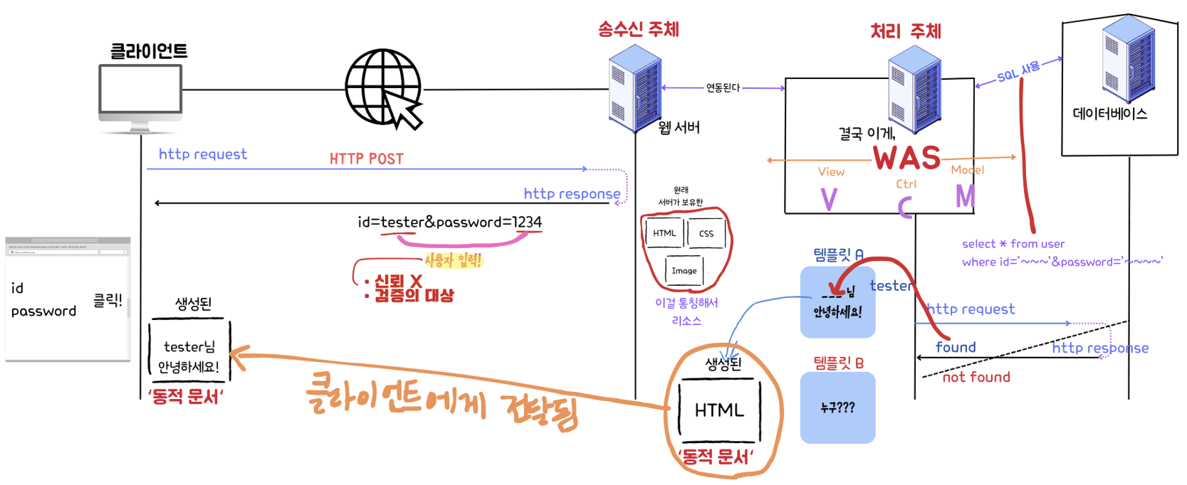 - View라는 산출물을 만들어서 전달해 주면 웹 서버가 그걸 클라이언트로 전달해주는 구조이다.