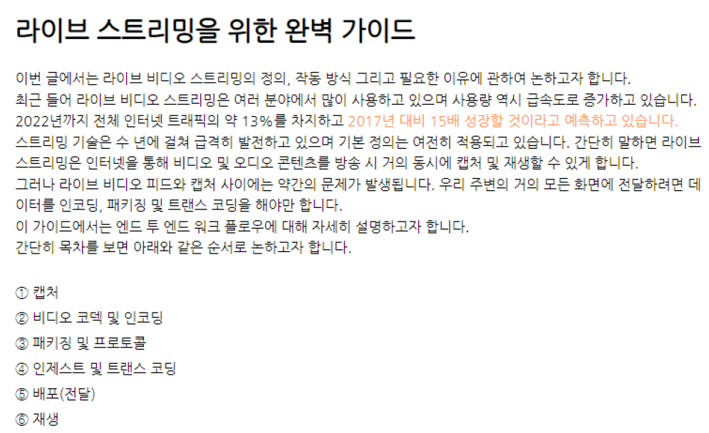 - 전송 방법 - 4) 라이브 스트리밍 서버를 따로 둘 것인가 아니면 웹 서버 부하 수준에서 끝낼 것인 등을 고민