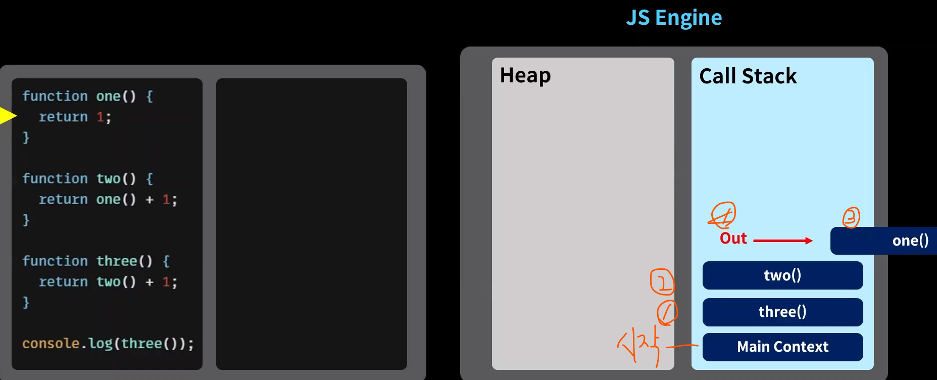 가장 마지막에 들어온 one() 함수가 가장 먼저 종료되고 가장 먼저 제거된다.