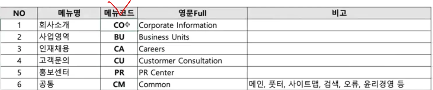 • 메뉴별 코드(영문 2자리) + 페이지 번호를 결합하여 의미를 부여.
