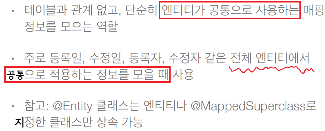 BaseEntity로 묶어서 새로 하나 만들고, @MappedSuperClass 넣어주고,