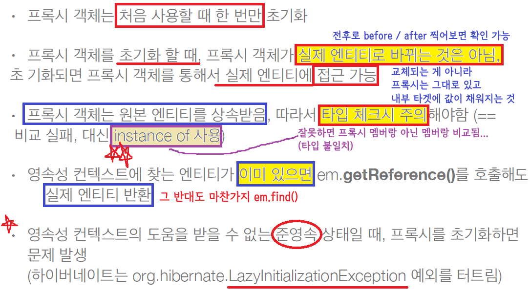 findM1 이 실제든 프록시든 상관 없이, 마치 자바 컬렉션에서 가져온 것을 == 비교 하듯이,이 == 비교가, 같은 영속성 컨텍스트에서 가져온 것이고, PK가 똑같으면 JPA에서는 항상 true를 반환해줘야 한다. (규칙 - 동일한 트랜잭션 내에서 보장해줌)=> JPA가 기본적으로 제공하는 매커니즘 중 하나다.