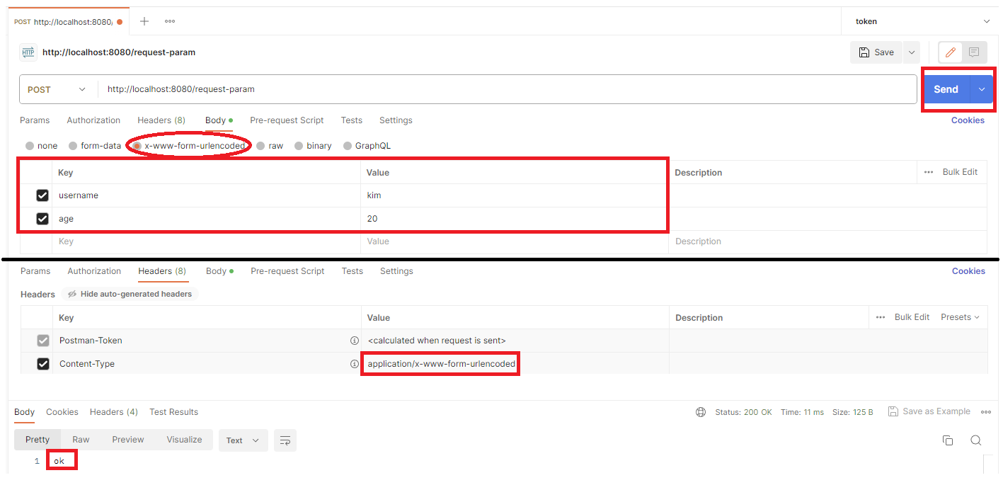 - 메시지 바디에 쿼리 파리미터 형식으로 데이터를 전달한다. username=hello&age=20