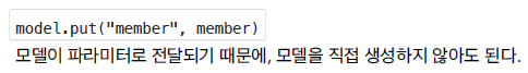 - 모델 데이터를 조작하는 데 사용되는 model 맵에 회원 정보를 추가합니다. "member"라는 키로 회원 정보를 저장하게 된다.